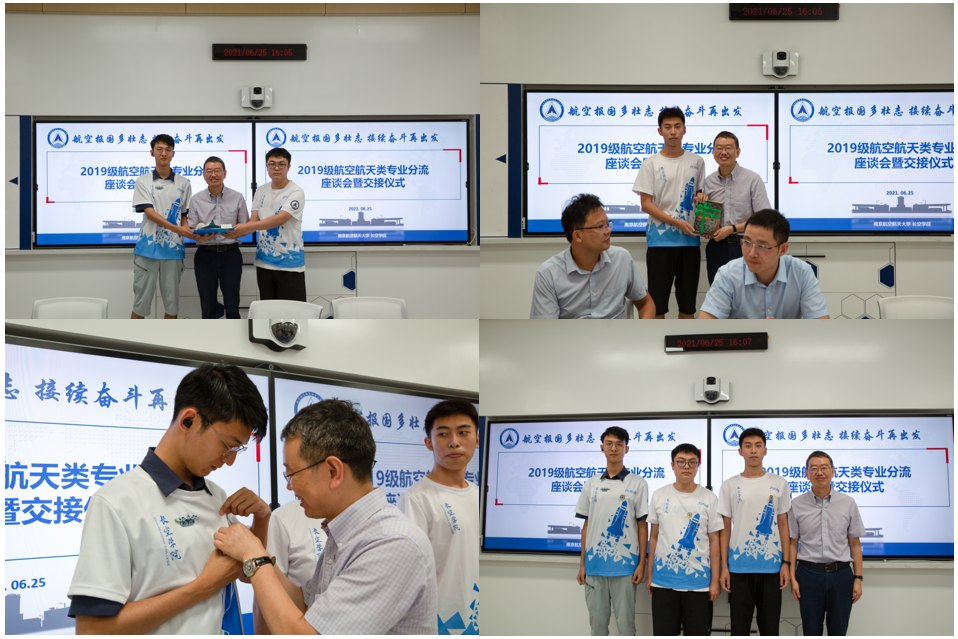 学生代表杨卜麟、王恺伯为学院捐赠其亲手制作的纪念模型,王云飞代表2019级全体赠与学院书册。蒋彦龙代表学院接受纪念品和赠与书册。据悉,2019级航空航天类专业学生自发捐赠了近300余册图书,存放于学院“润&致”文化长廊。学院也特别为2019级航空航天类专业学生定制了“润&致”纪念徽章,并由蒋彦龙亲自为部分学生代表佩戴纪念徽章,以期借此来传承长空文化,弘扬长空精神,寄语美好未来。